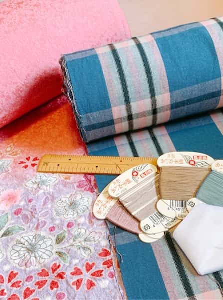 縫い糸を選び、柄や用尺を見て裁断